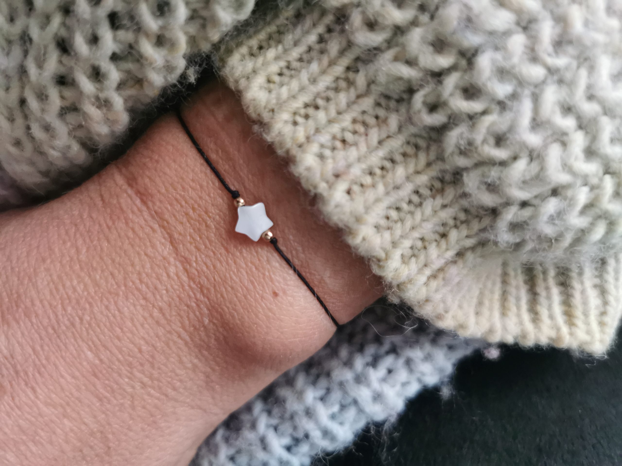 Bransoletka na regulowanym sznureczku z gwiazdką z masy perłowej. Kuleczki gold filled 2mm.