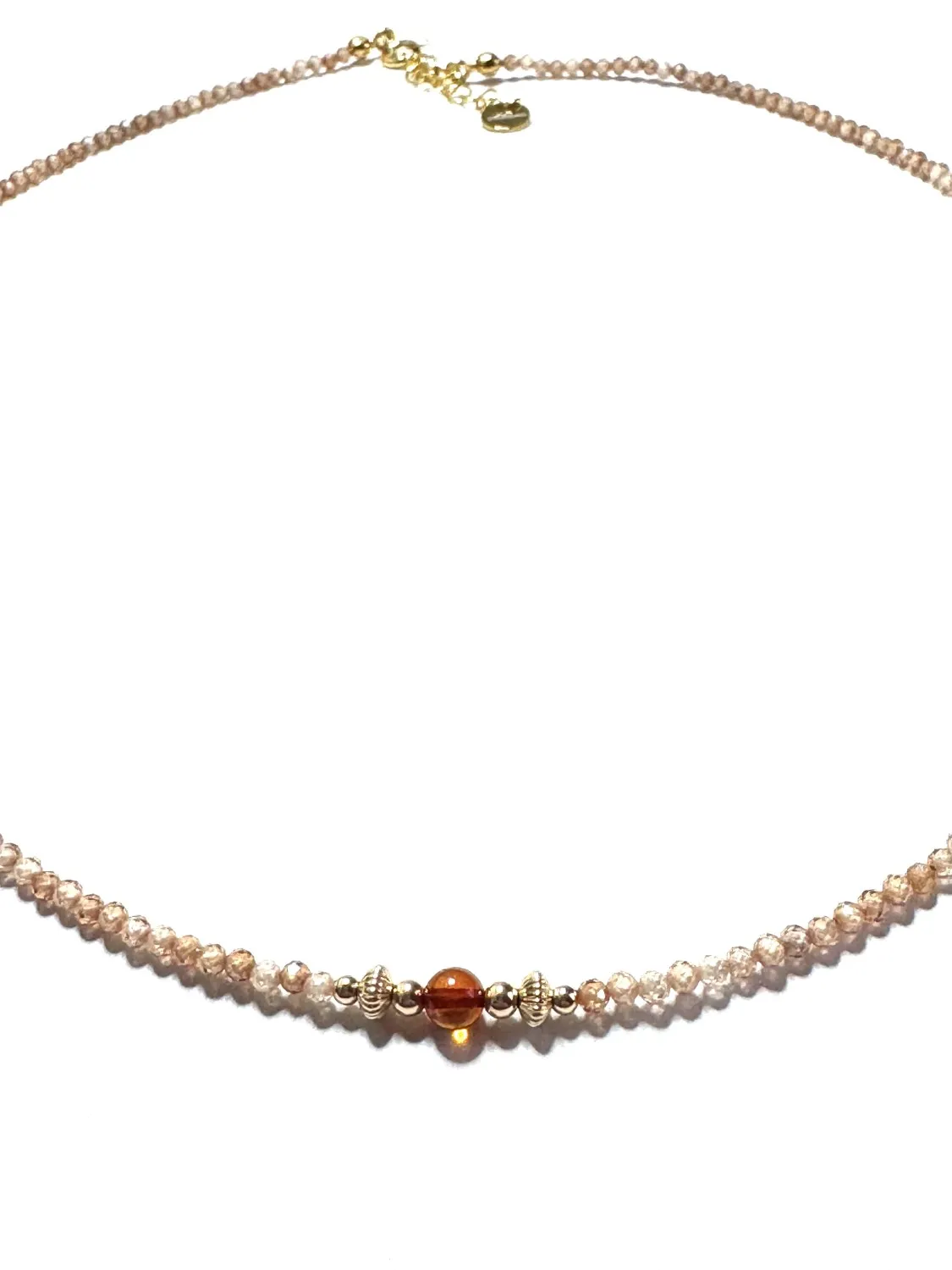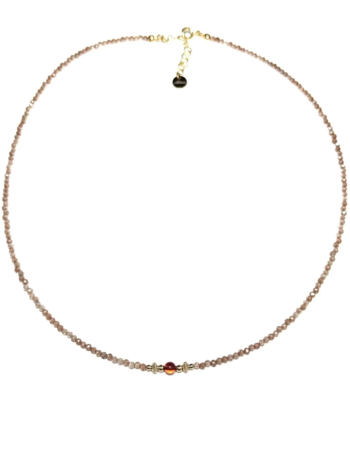 Naszyjnik sun ręcznie wykonany ze szlifowanych kamieni 2mm, elementów ze srebra pokrytego złotem o grubości 1 microna oraz gold filled. Dopełnieniem naszyjnika jest kulka z bursztynu.