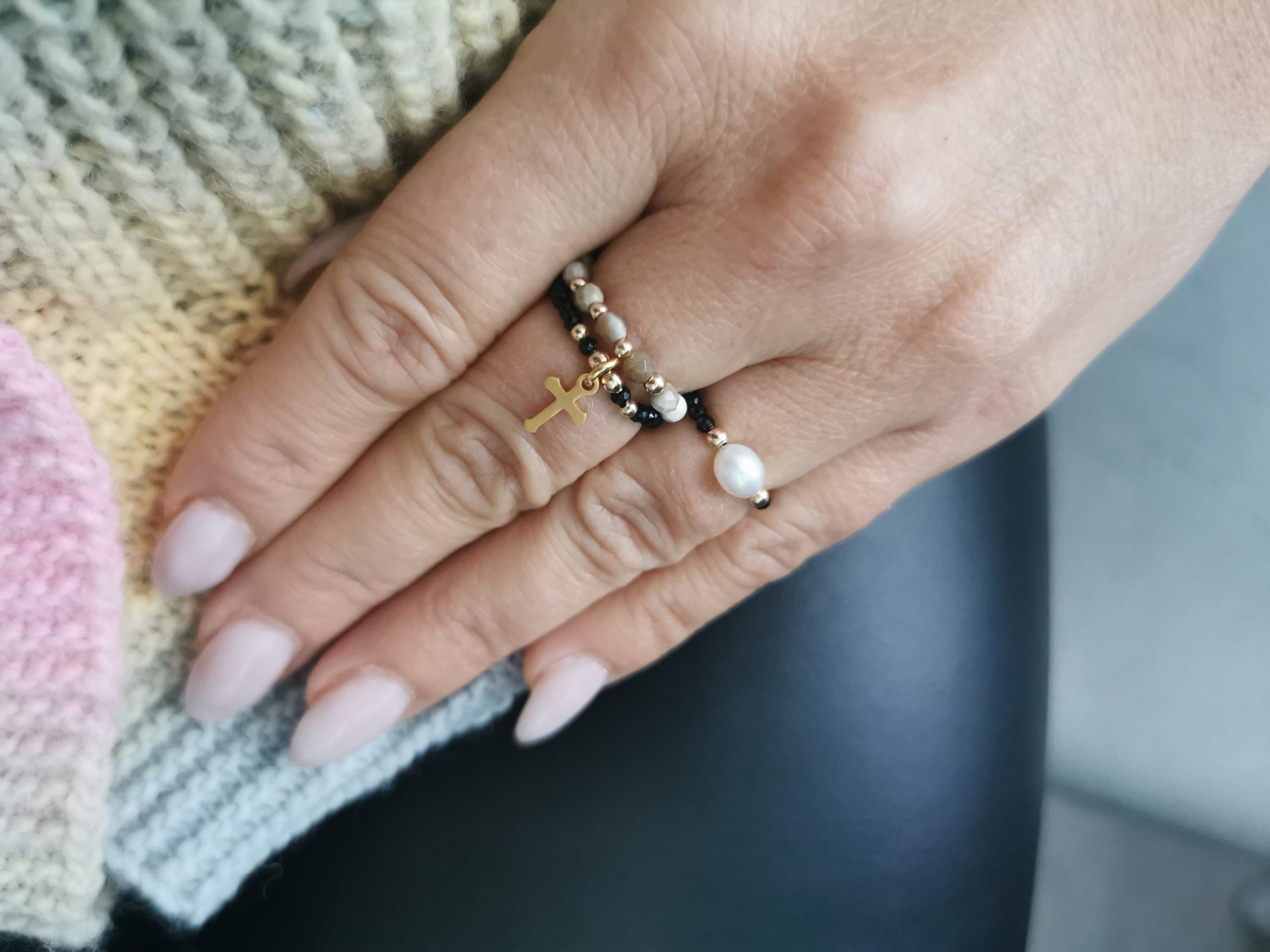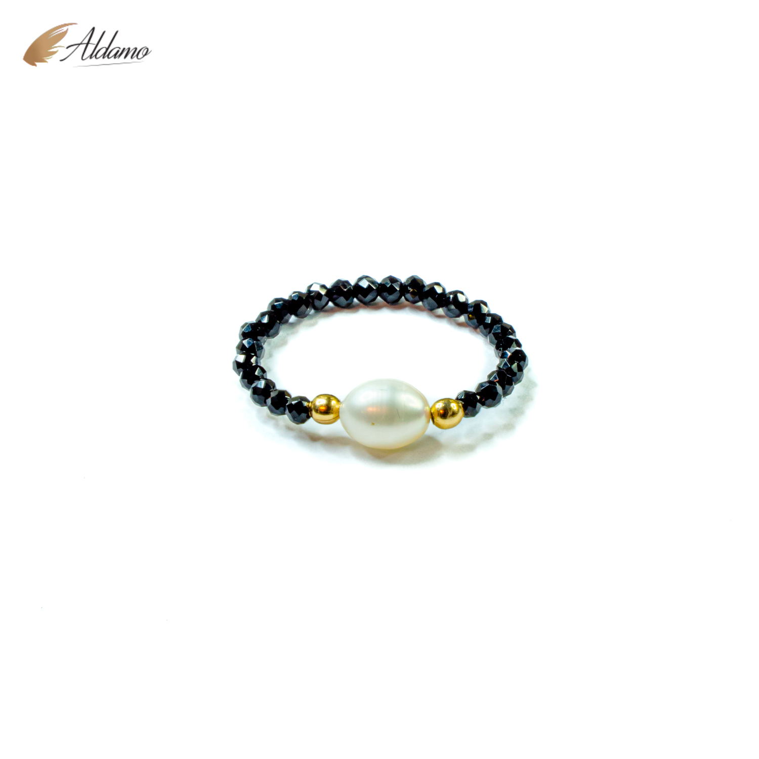 Pierścionek elastyczny wykonany z czarnego turmalinu 2mm,perły naturalnej hodowlanej 4mm oraz kuleczek gold-filled.