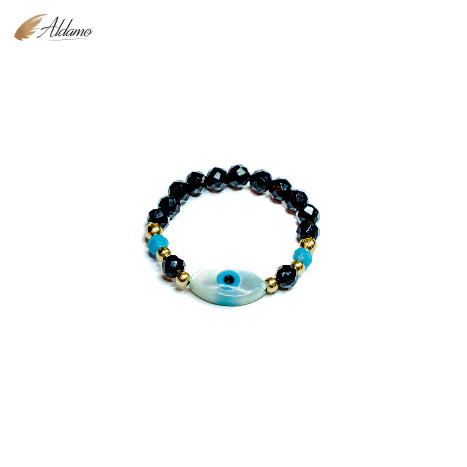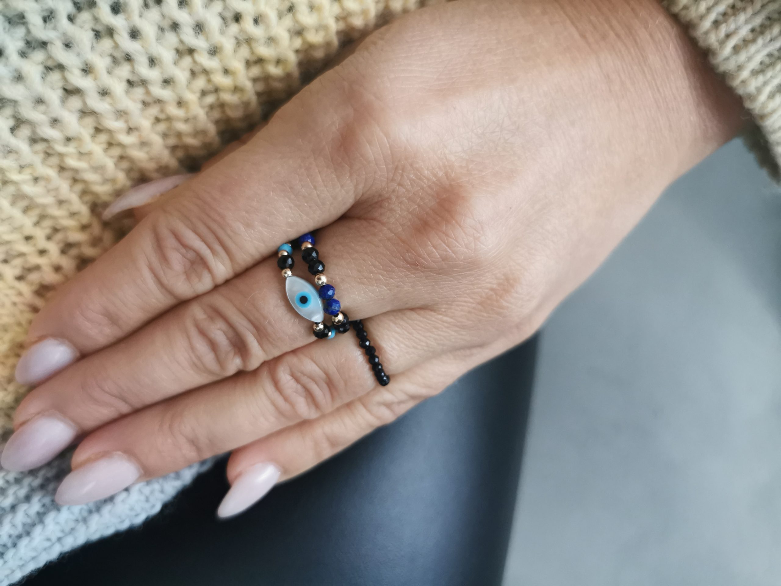 Pierścionek elastyczny wykonany z czarnego turmalinu ,turkusu ok 3mm,zdobiony okiem proroka z masy perłowej oraz kuleczek gold-filled.