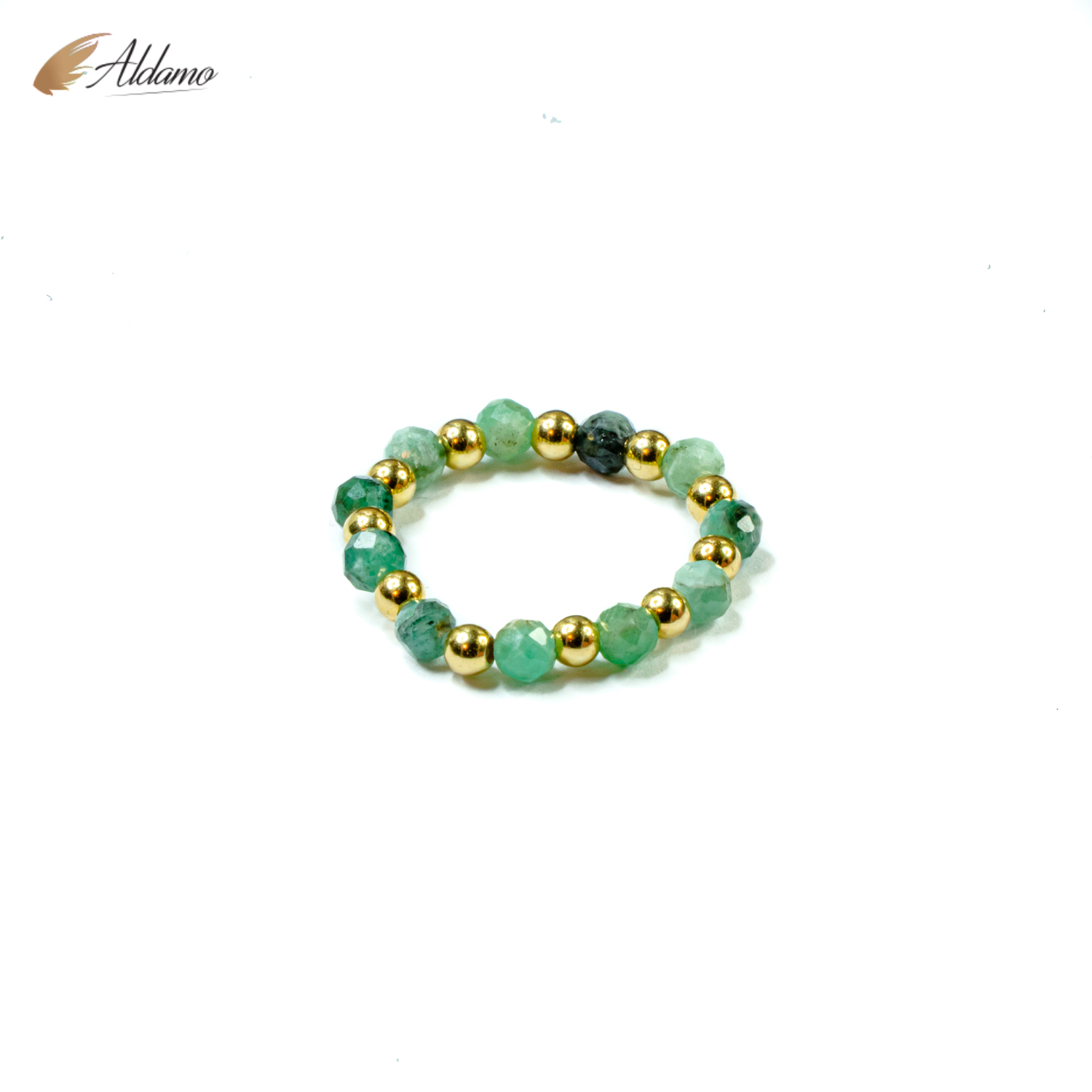 Pierścionek elastyczny wykonany z szmaragdu zielonego 3mm oraz kuleczek gold-filled.